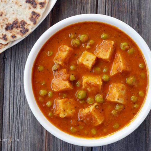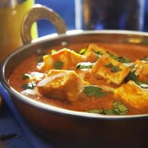 Cubos de queijo ricota preparados ao molho makhani com manteiga.