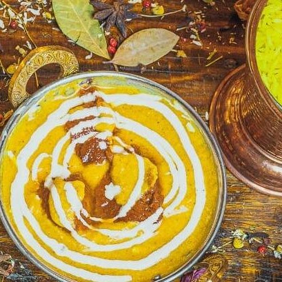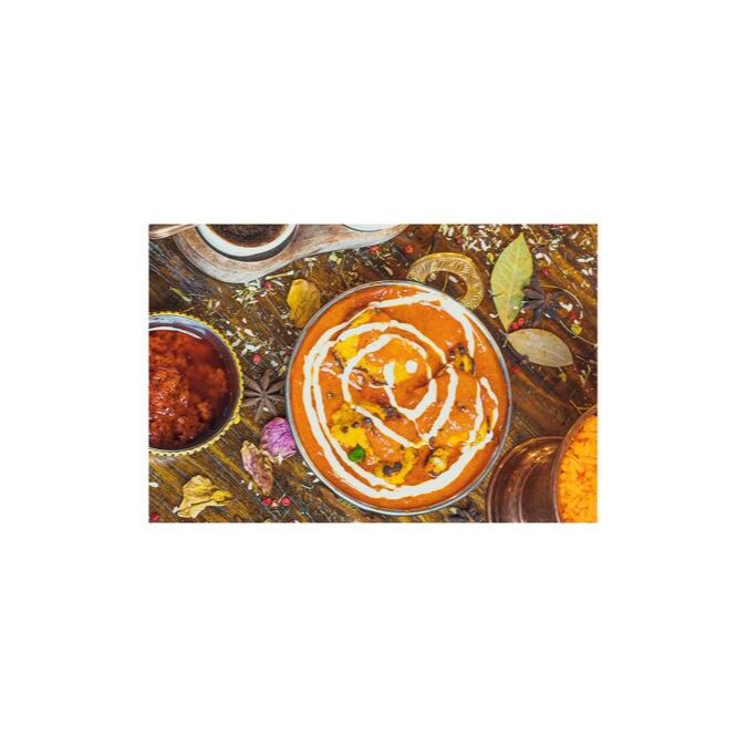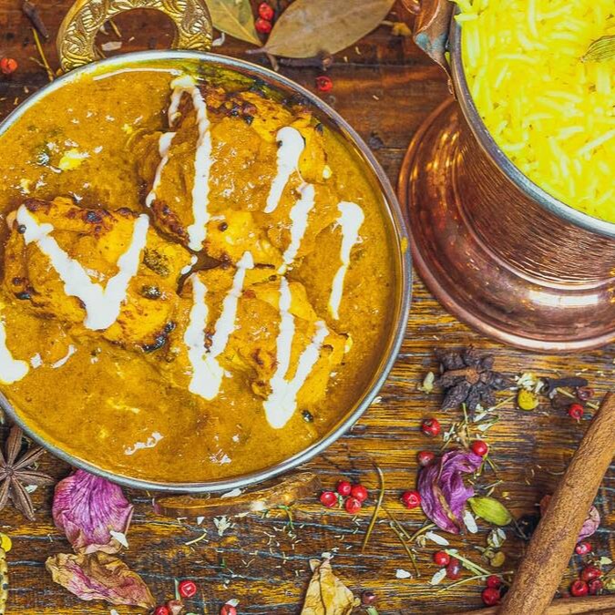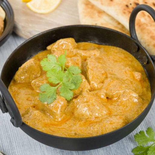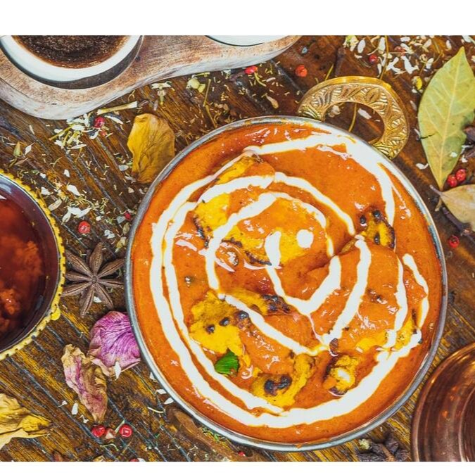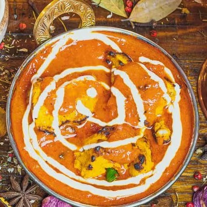 Frango em cubos assados no tandoor ao molho makhani com manteiga e creme de leite.