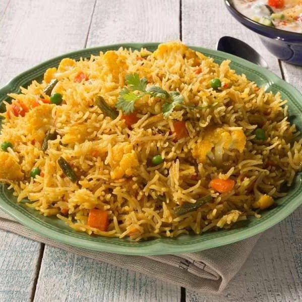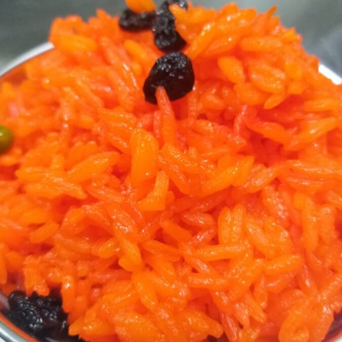 Arroz colorido com ervilhas, uva passas, manteiga e especiarias.