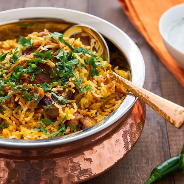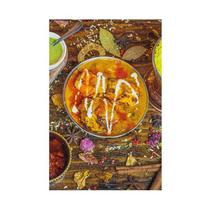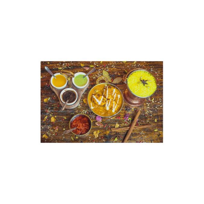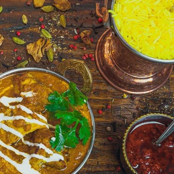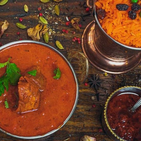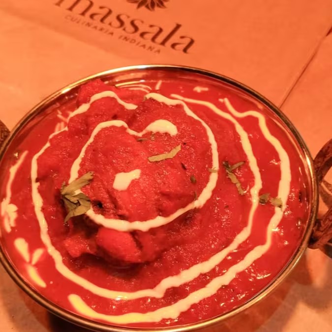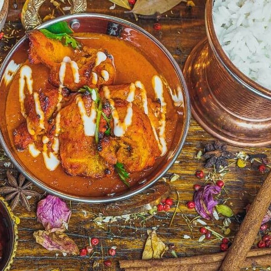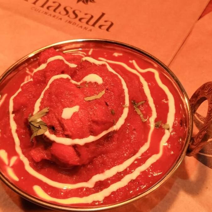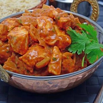 Frango em cubos assados no tandoor, servido ao molho tomate, cebola e especiarias. Prato picante.
