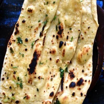 Pão especial feito no forno tandoor , recheado com queijo minas, coberto com pasta de alho.