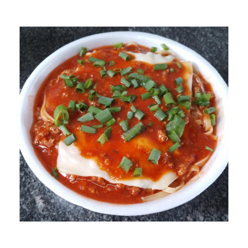 Massa Linguine - Molho a Bolonhesa - Mussarela - Cebolinhas Frescas.