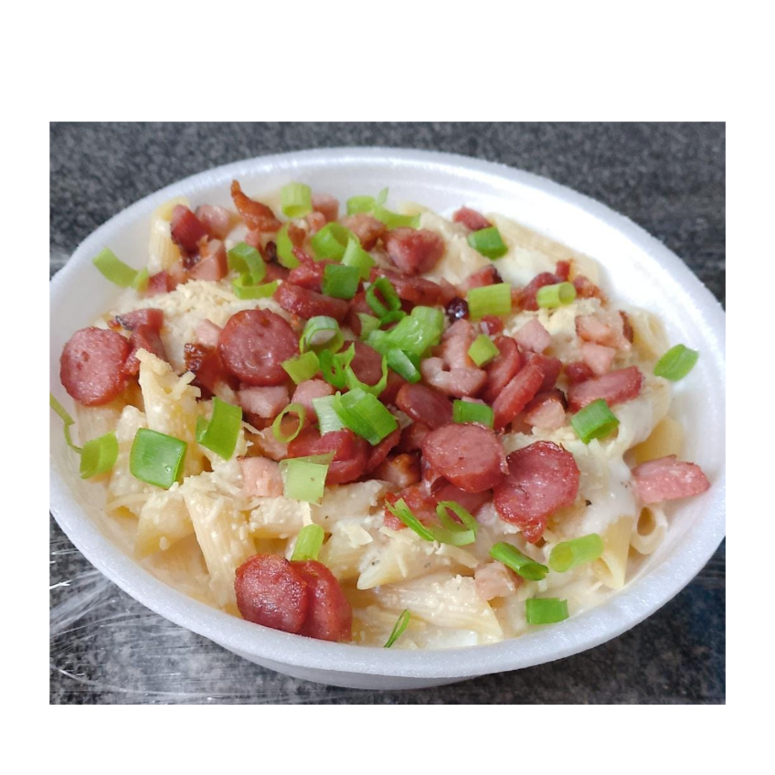 Massa Penne - Molho Branco - Bacon - Queijo parmesão e Cebolinhas Frescas.