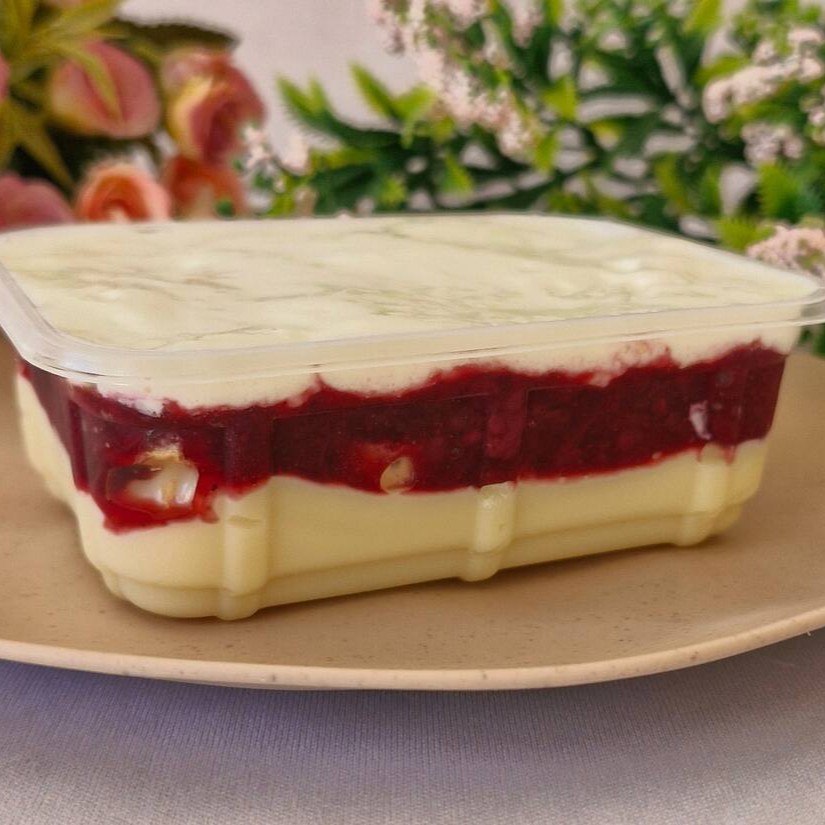 Delicioso bolo de baunilha com massa fofinha e molhadinha, geleia de frutas vermelhas e brigadeiro cremoso de leite Ninho. Aprox.: 220gr