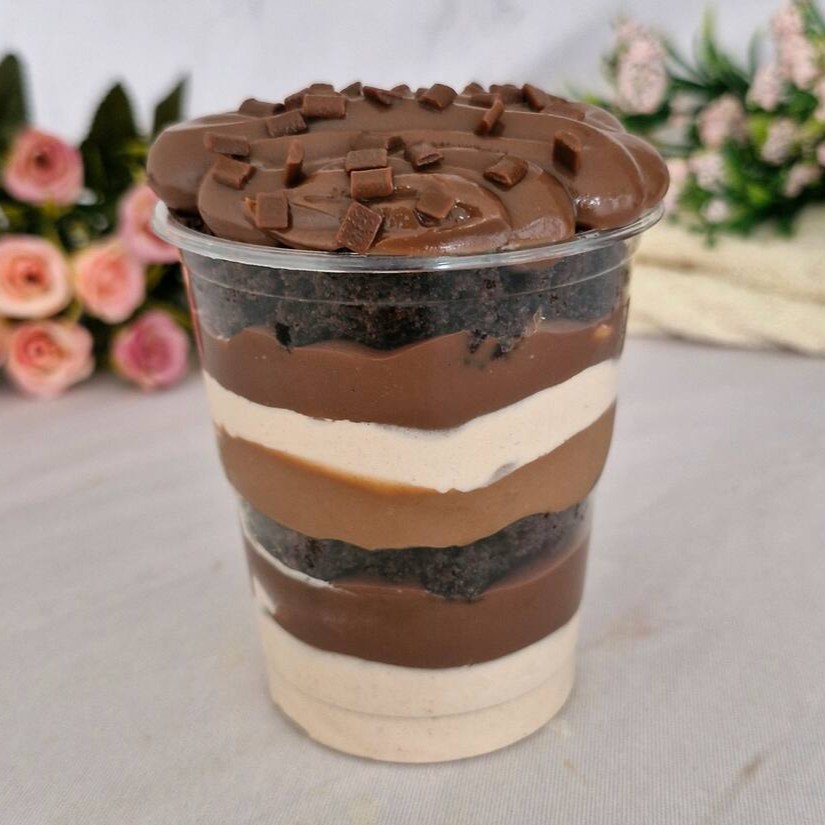 Delicioso copo da felicidade recheado com creme de chocolate, brigadeiro de chocolate, ganache de chocolate nobre e brownie. Copo de 300ml, com peso final aproximado de 350gr.
