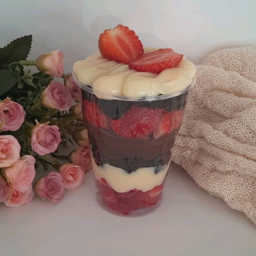 Delicioso copo da felicidade recheado com morangos frescos picadinhos, brownie molhadinho e chocolatudo e nossos brigadeiros cremosos de chocolate e leite Ninho. Copo de 300ml, com peso final aproximado de 350gr.