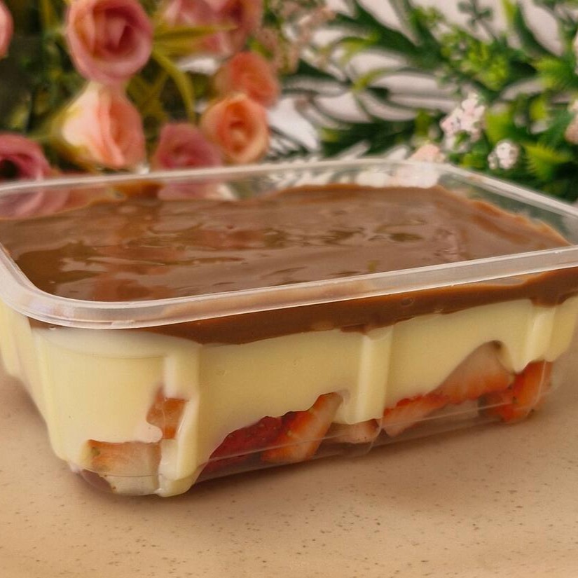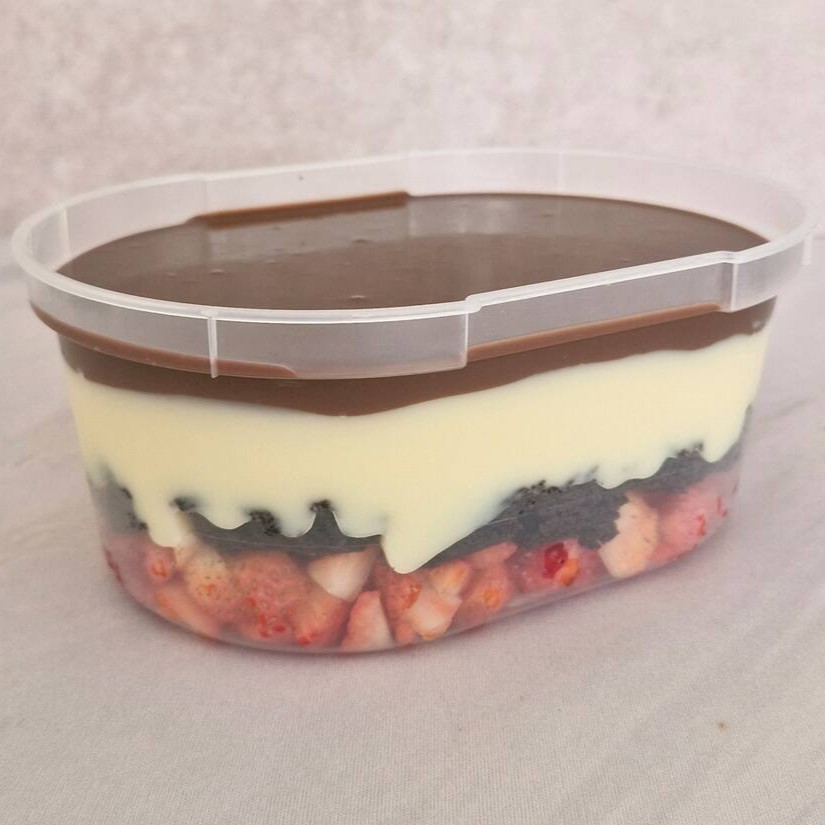 Delicioso pote recheado com morangos frescos picadinhos, brownie, brigadeiro cremoso de leite Ninho e ganache de chocolate nobre. Pote de 150ml, com peso final aproximado de 160gr.