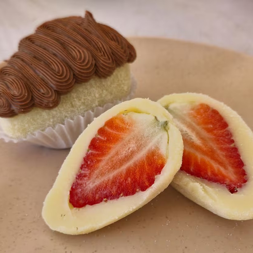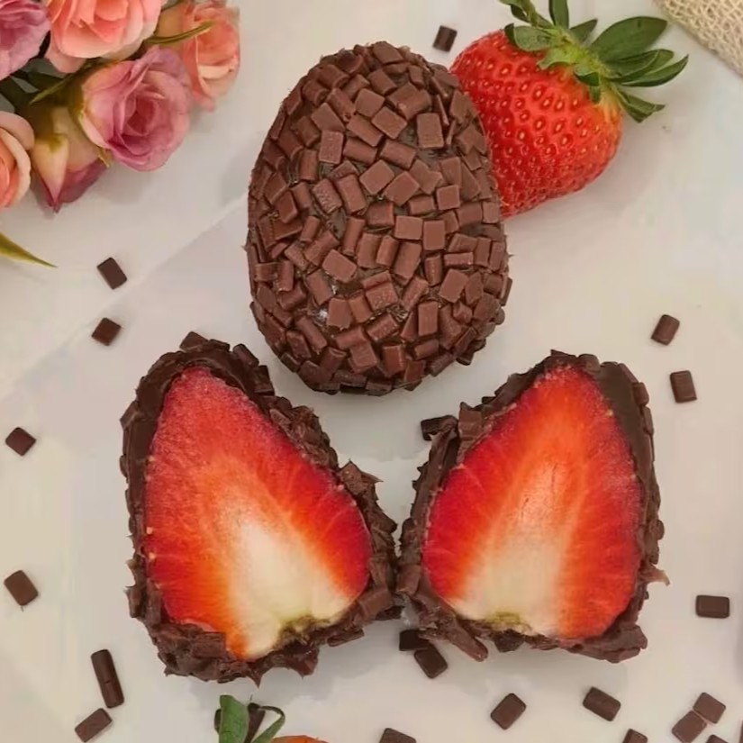 Deliciosa coxinha com brigadeiro de chocolate, morango fresco e granule de chocolate nobre. Aprox. 70 - 80gr.