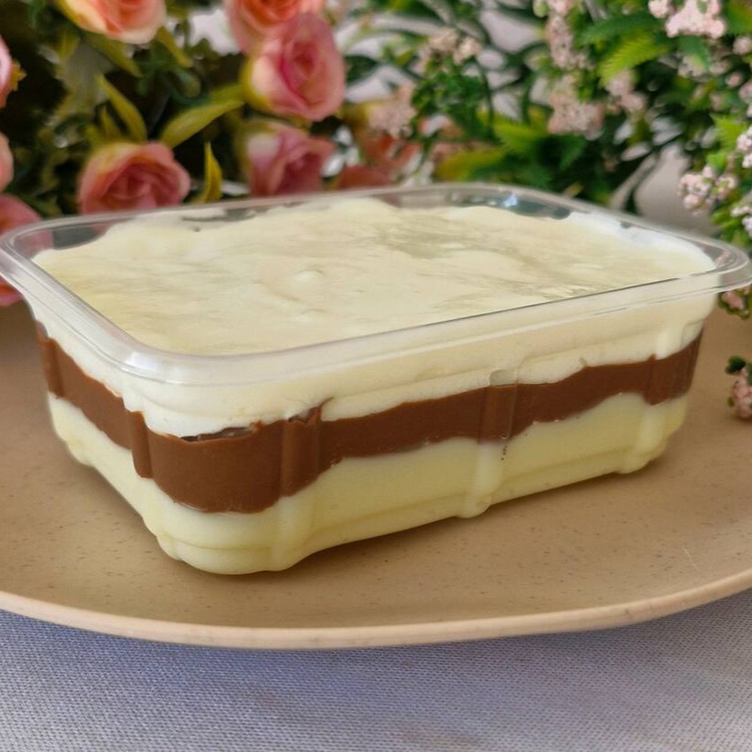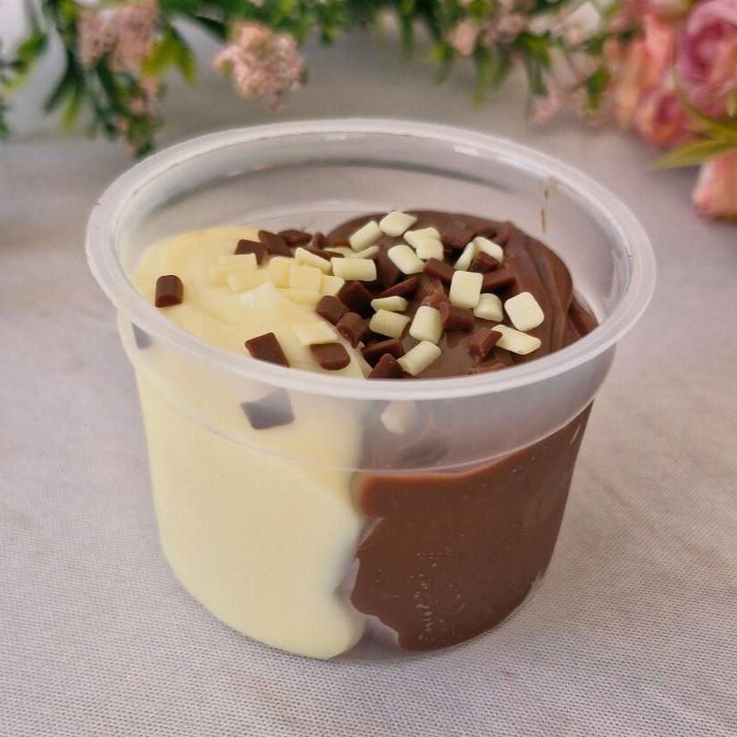 Brigadeiro cremoso de colher, metade chocolate e metade leite Ninho. Finalizado com granulado de chocolate nobre. Pote 140ml, com peso final aproximado de 140gr. Atenção a gramatura, pote tamanho pequeno