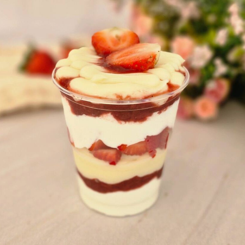 Delicioso copo da felicidade recheado com creme de leite Ninho, geleia de frutas vermelhas, brigadeiro de Leite Ninho e morangos frescos picadinhos. Copo de 300ml, com peso final aproximado de 350gr.