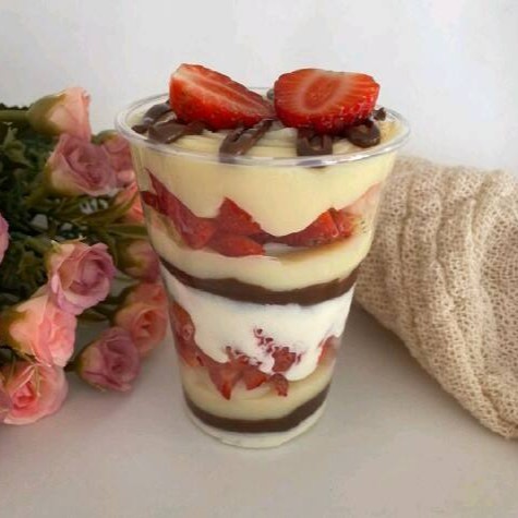 Delicioso copo recheado com bastante morangos frescos picadinhos, nosso brigadeiro cremosão de leite Ninho, creme de Leite Ninho e Nutella pura. Copo de 300ml, com peso final aproximado de 350gr.