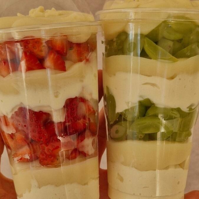 Delicioso copo da felicidade recheado com creme de Leite Ninho, brigadeiro de Leite Ninho e uvas verdes sem semente ou morangos frescos picadinhos. Copo de 300ml, com peso final aproximado de 350gr.