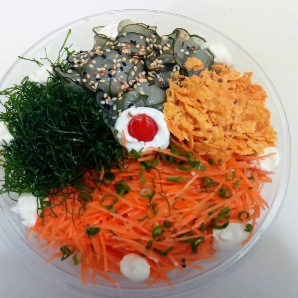 Delicie-se com nosso saboroso 'Poke Califórnia', uma estrela do nosso '#Festival Poke Bowl'. Esta obra-prima culinária é composta por generosos cubos de salmão fresco, complementados com a doce e suculenta manga. A crocância é garantida pelo pepino japonês, enquanto o kani-kama adiciona um sabor marítimo único. Tudo isso é realçado com o toque levemente torrado do gergelim. Para finalizar, uma generosa camada de suave cream cheese é adicionada, proporcionando uma textura cremosa e um sabor irresistível. Experimente e se apaixone!