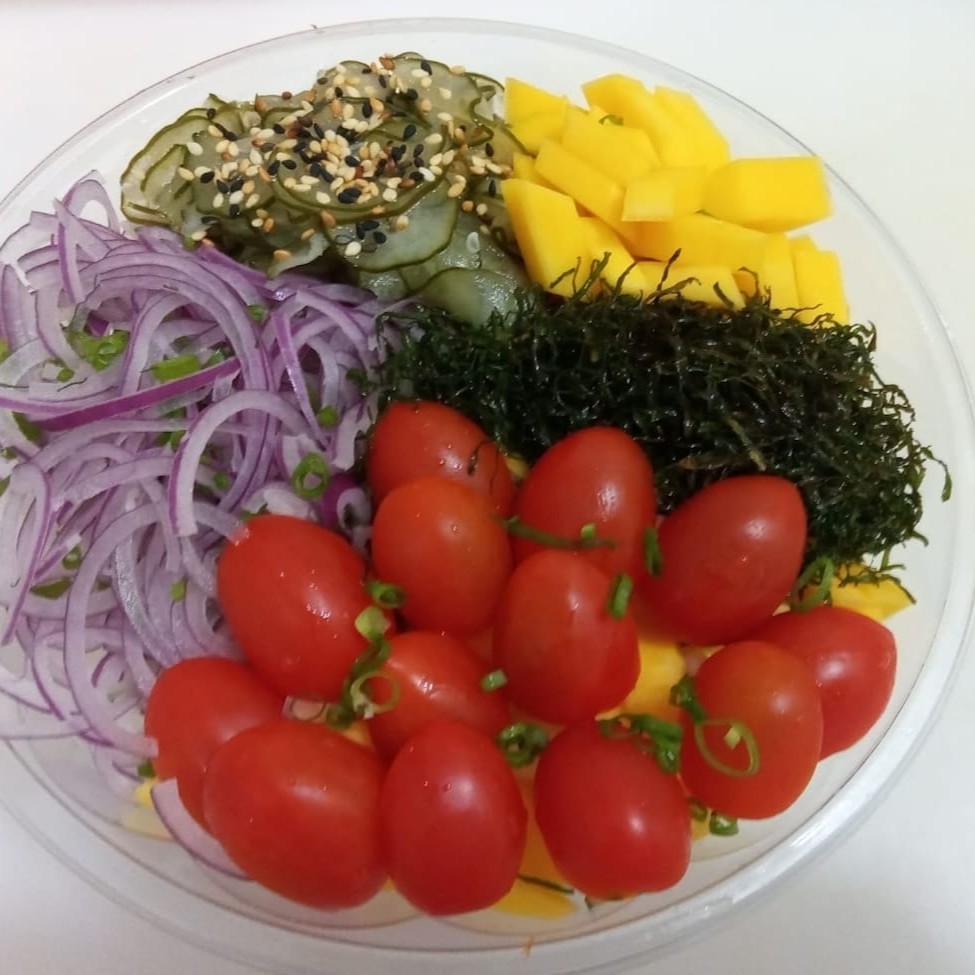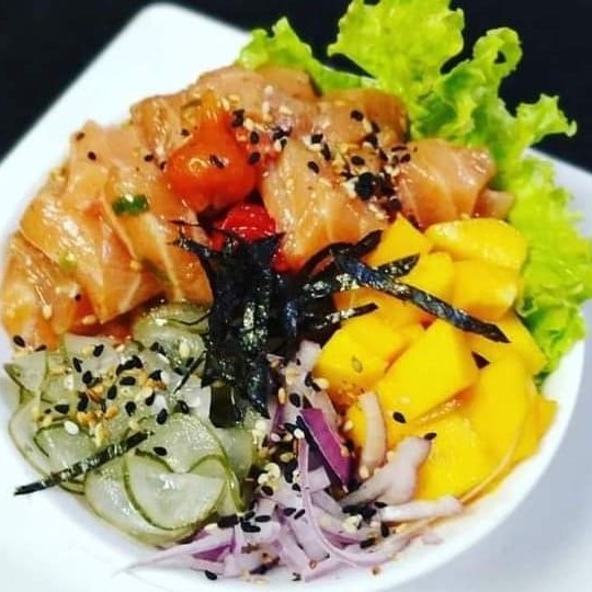 O 'Poke Tropical' é uma opulenta seleção do nosso #festival Poke Bowl. É uma harmoniosa combinação de Gohan, delicadamente misturado com cubos suculentos de salmão. Oferece ainda uma explosão de sabores tropicais com a adição de manga doce e tomate cereja fresco. A crocância é garantida com a inclusão de pepino e de gergelim torrado, que traz um toque tostado ao prato. A cebola roxa adiciona um sabor agridoce, enquanto a alface fornece uma textura leve e refrescante. Um prato colorido, vibrante e absolutamente delicioso!