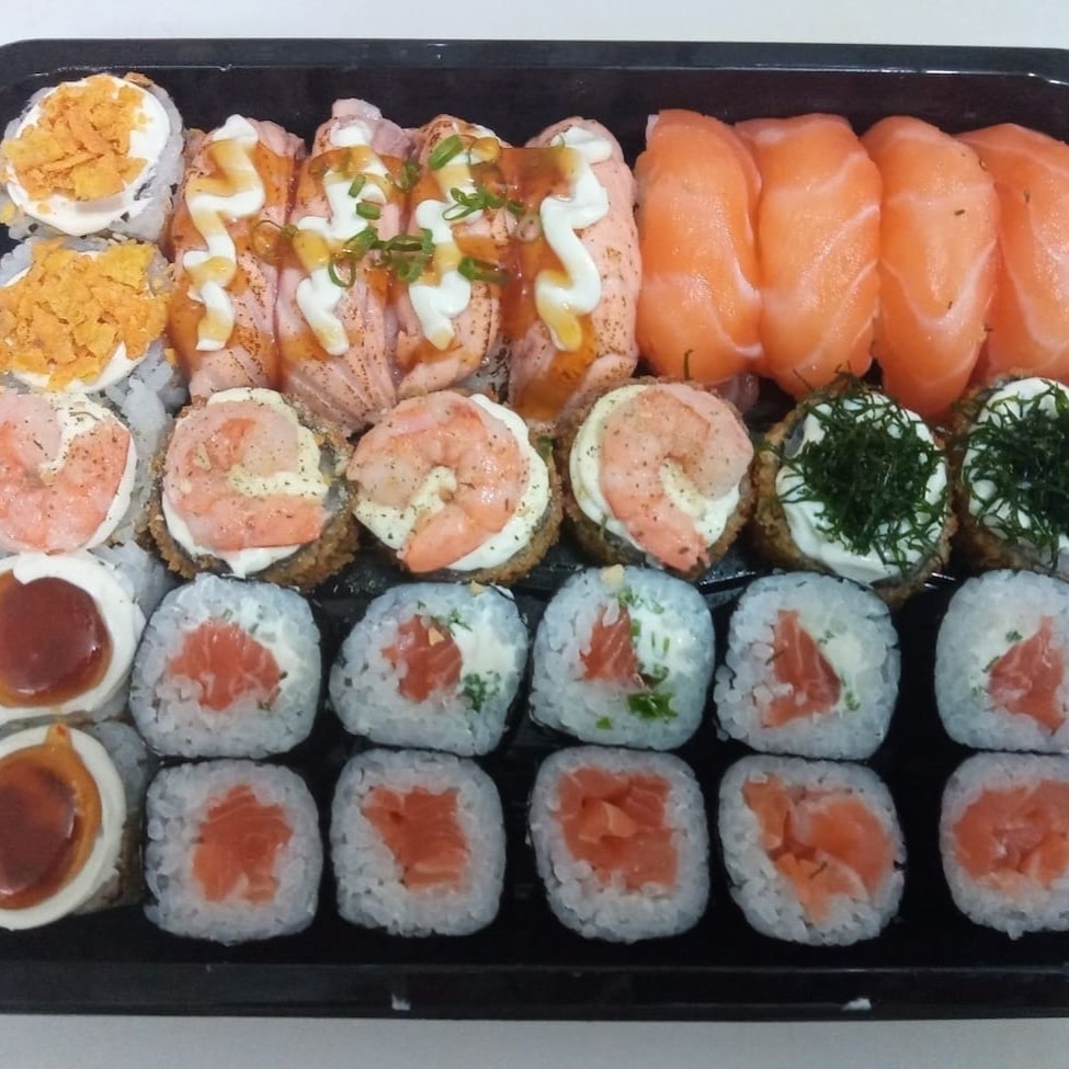 O 'Box 28 - Box Essencial', composto por 40 peças primorosamente trabalhadas, da categoria 'Sushi Fresco Bem Servido', é uma verdadeira sinfonia de sabores únicos e irresistíveis. Acompanhado de um sofisticado Kit de Molhos, este box inclui uma variedade de delícias: 5 Joes de Salmão Filadélfia, 5 Niguiris de Salmão Maçaricado, 5 Makis de Salmão Filadélfia e 5 Niguiris Skin, todos meticulosamente preparados. Mas a experiência não para por aí! O Box também conta com 5 Uramakis de Salmão Grelhado à Moda, 5 Uramakis de Salmão Grelhado e 5 Niguiris de Salmão, além de mais 5 Makis de Salmão. Cada peça é uma pequena obra de arte culinária, proporcionando uma experiência gastronômica inesquecível e de dar água na boca.