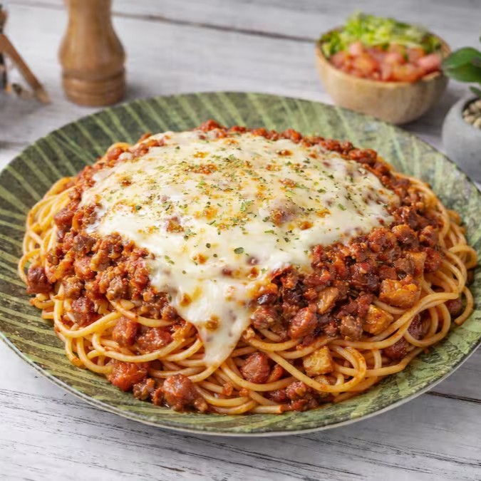 Delicioso Macarrão Espaguete Bolonhesa com molho de tomate artesanal e Queijo derretido.