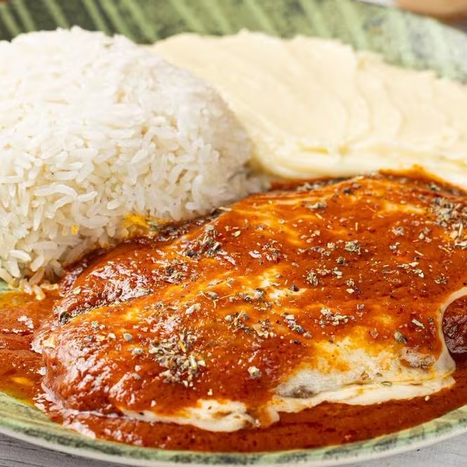 Delicioso Frango à Parmegiana com Molho de Tomate artesanal cremoso, queijo derretido, file de frango empanado na farinha, toque de orégano, purê de batata e arroz branco.