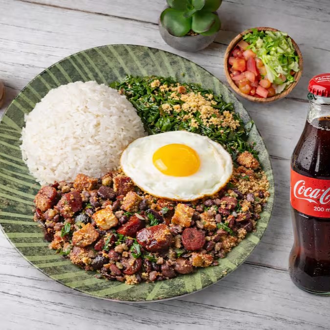 Delicioso Tropeiro Completo com Ovo Frito, um dos pratos mais amados dos mineiros. Acompanha arroz branco, ovo frito e couve refogada no alho frito e manteiga. + Coca-Cola Geladinha