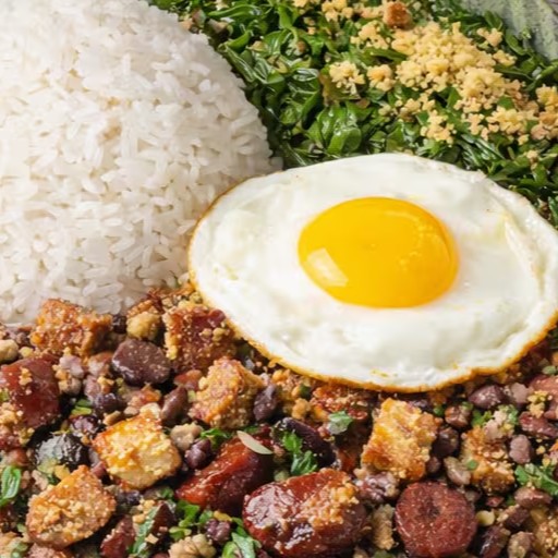 Delicioso Tropeiro Completo com Ovo Frito, um dos pratos mais amados dos mineiros. Acompanha arroz branco, ovo frito e couve refogada no alho frito e manteiga.