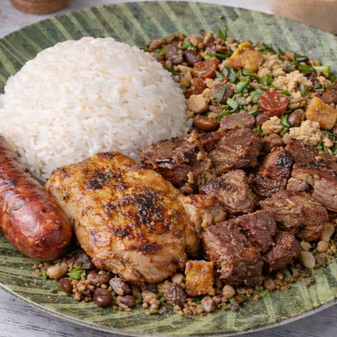 Delicioso Tropeiro Completo com Churrasco Misto um dos pratos mais amados dos mineiros. Acompanha arroz branco, ovo frito e couve refogada no alho frito e manteiga.