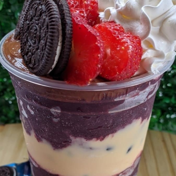 Copo de 700 ml com creme de açaí ,leite condensado ,leite em pó,Ovomaltine ,morango e Oréo....