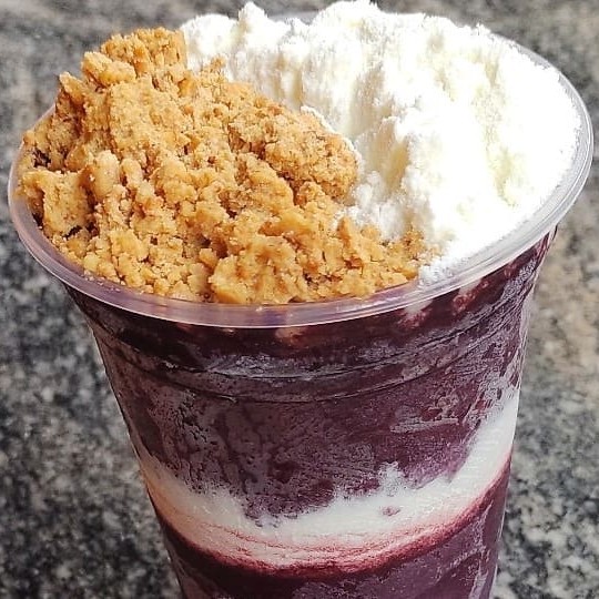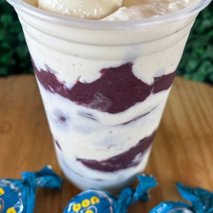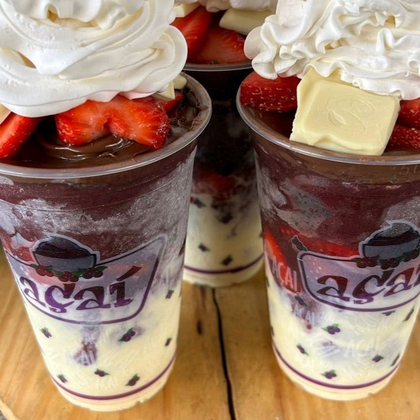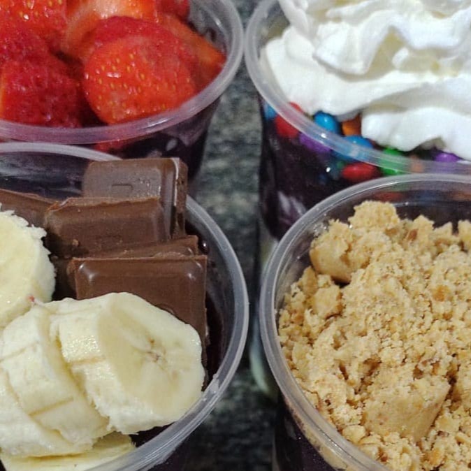 1 - Acai , Leite Em Po , Leite Condensado , Paçoca 2 - Acai , Leite Em Po , Leite Condensado , Banana E Chantily E Confete 3- Acai , Leite Em Po , Leite Condensado , Morangos 4 - Acai , Leite Em Po , Leite Condensado , Banana E Bombom