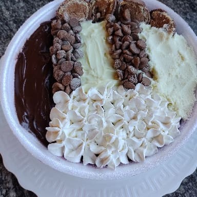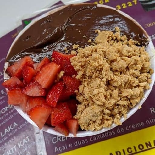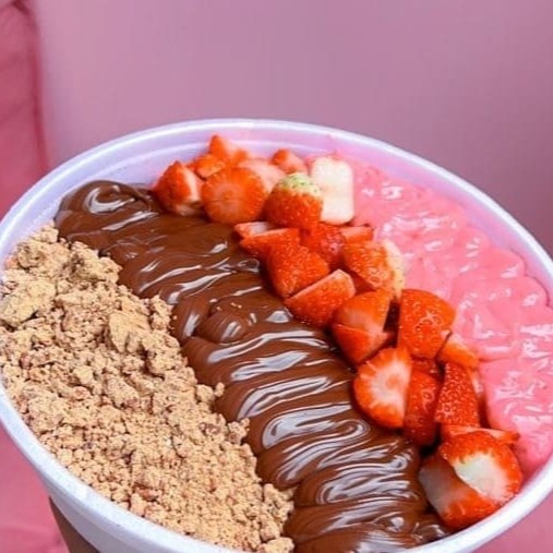 Cumbuca de 500 ml Açaí Leite em pó Chantily Creme de morango Chocolate Ouro Branco Calda de morango Confete