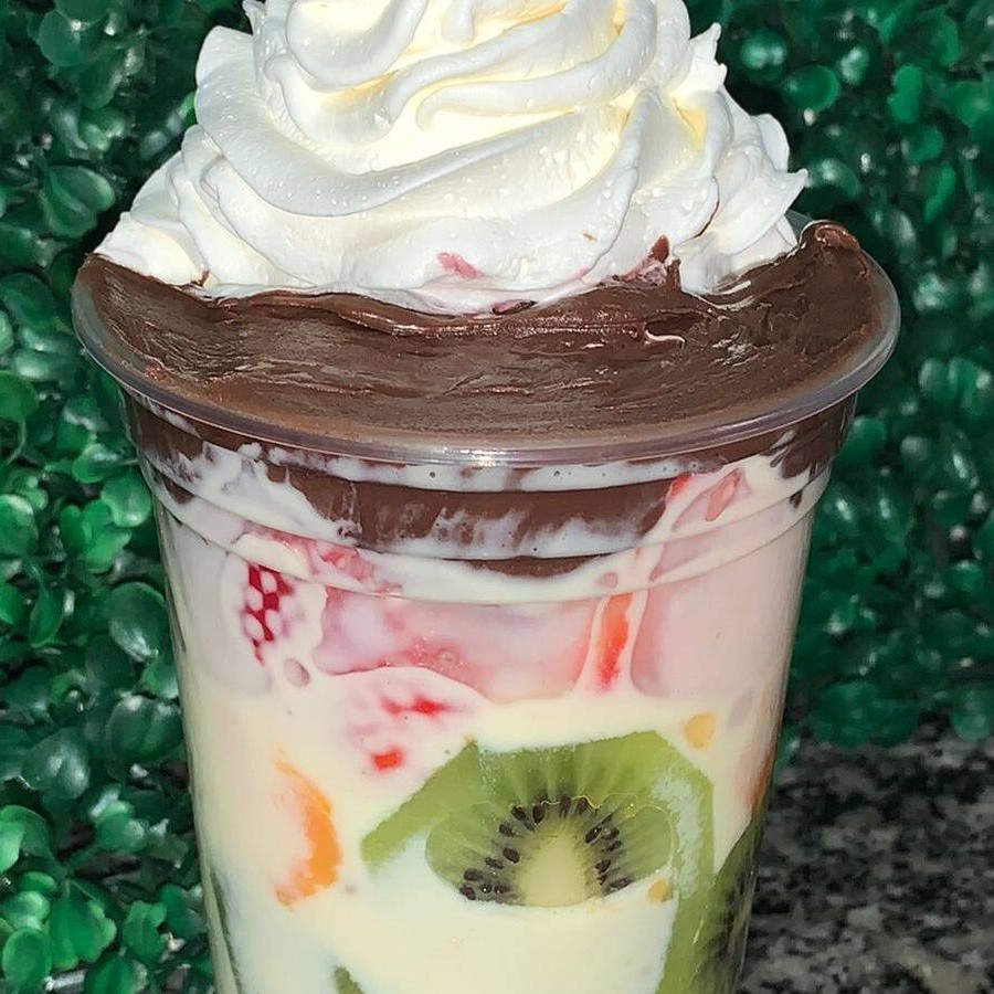 Copo de 500 ml com : Manga Banana Kiwi Morango Melão Chantily Nutella Delicioso creme branco