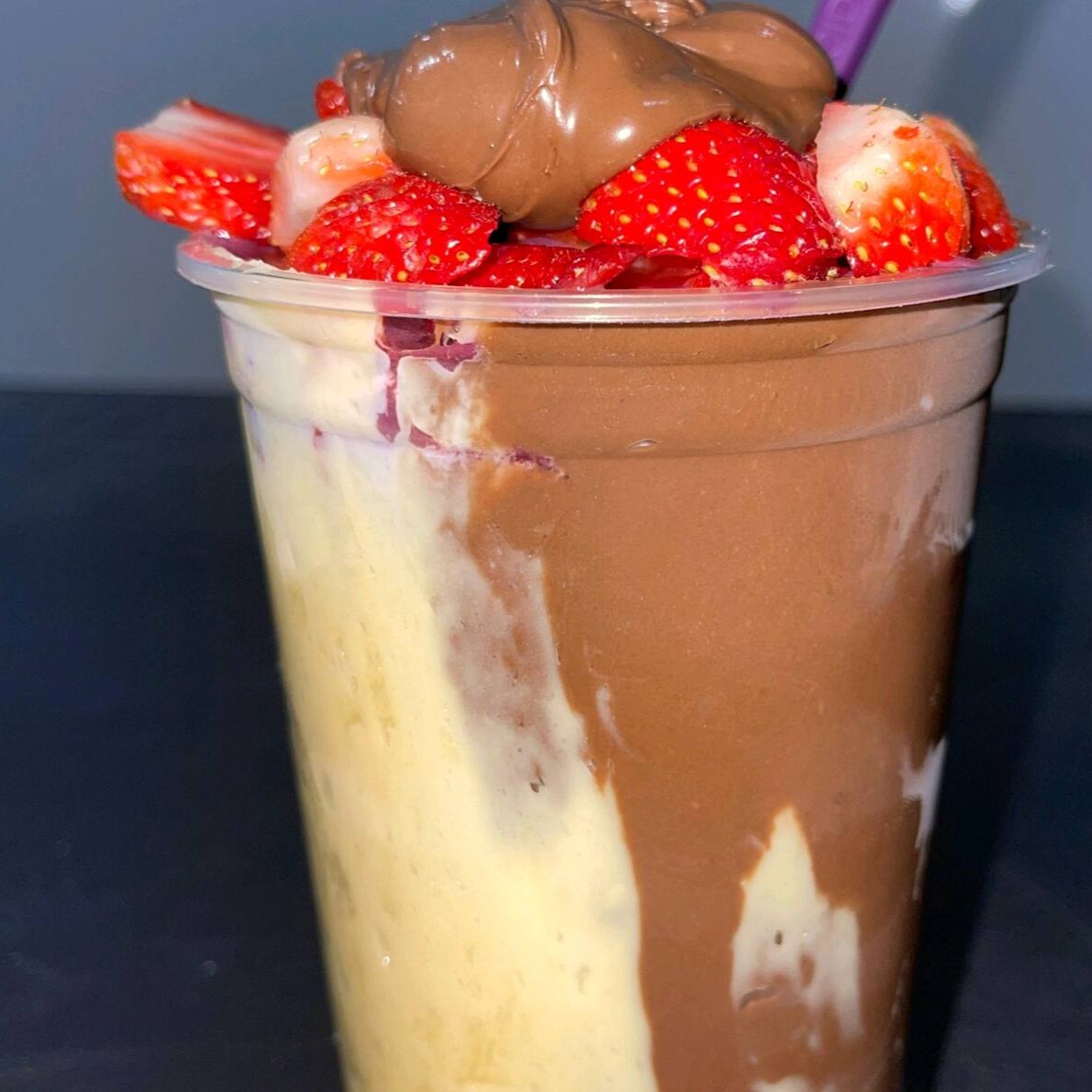 Creme de açaí copo 500 ml Creme Ninho Morangos em pedaços no meio do copo Nutella Chantily Laka. Mais morangos por cima do copo