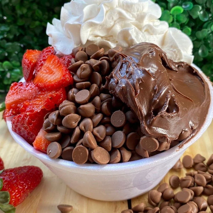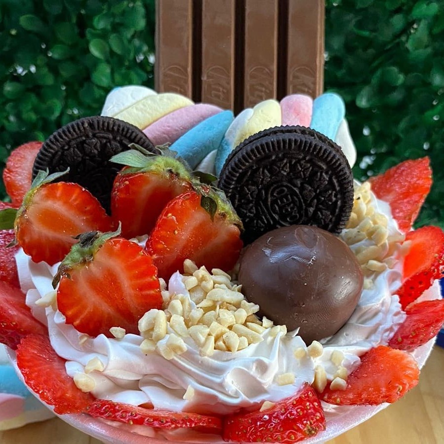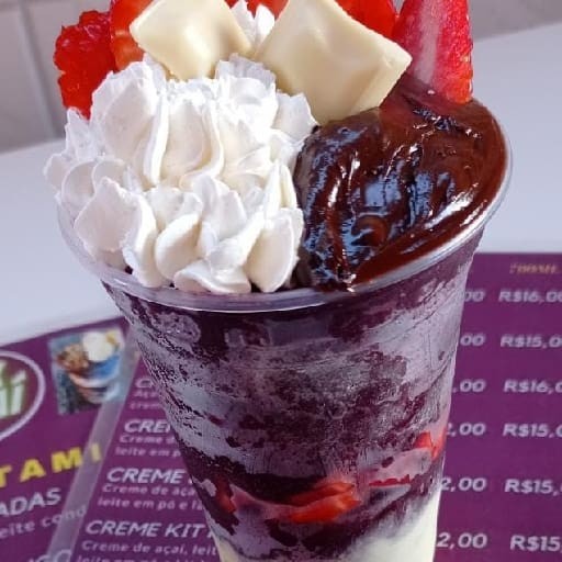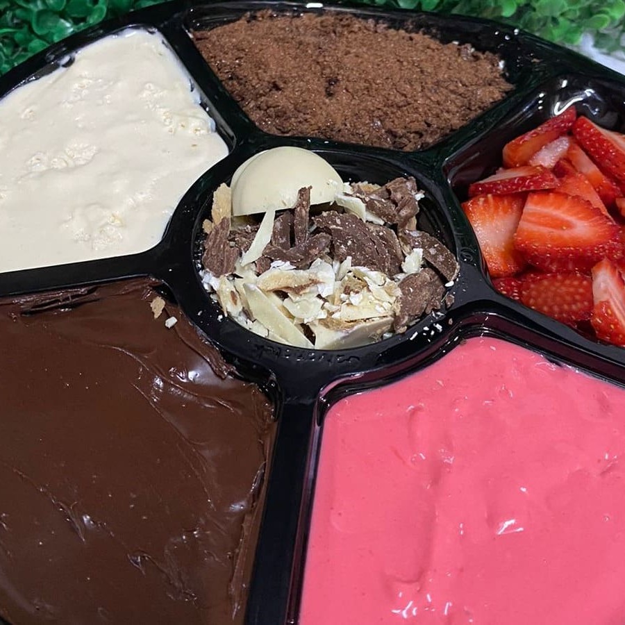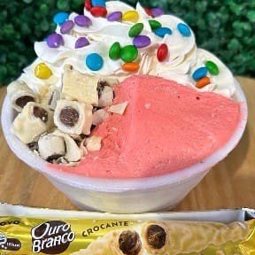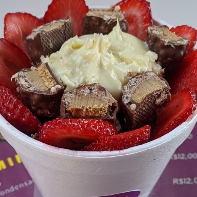 Cumbuca de 500 ml Açaí Leite em pó Chantily Creme de morango Chocolate Ouro Branco Calda de morango Confete