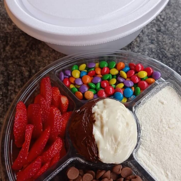 Uma marmita de creme de açaí (1 kilo ) com morango,leite em po,leite condensado ,granola e chocolate suflair...