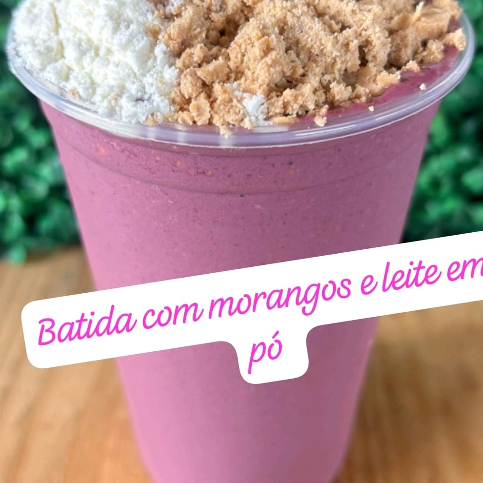 Copo de 500 ml de açaí Leite em po Leite condensado Creme de morango Morangos fresquinhos