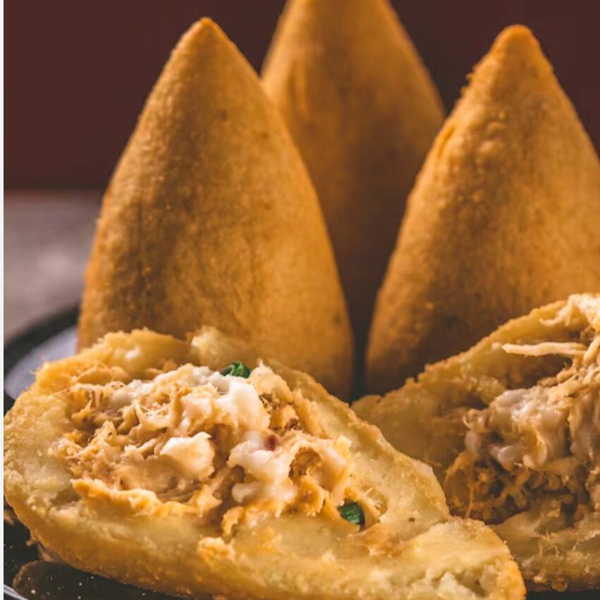 Uma saborosa coxinha com massa de batata, com um delicioso recheio de frango
