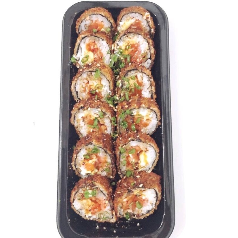 Camarão Empanado e Frito Enrolado Com Salmao e Cream Cheese e Macaricado Finalizado Com Teriaky, Geleia De Pimenta E Cebolinha.
