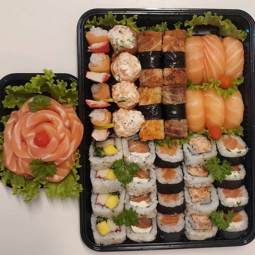 6 Niguiri Salmão, 4 Niguiri Pele, 4 Djoe Filadélfia, 4 Maki de Salmão,