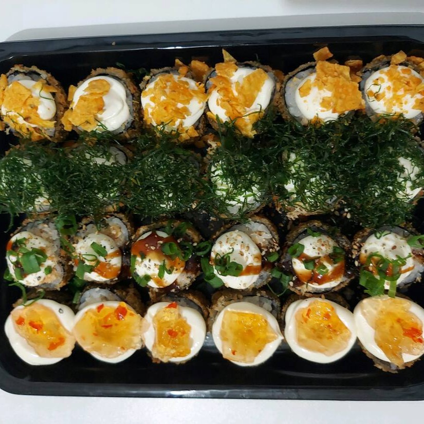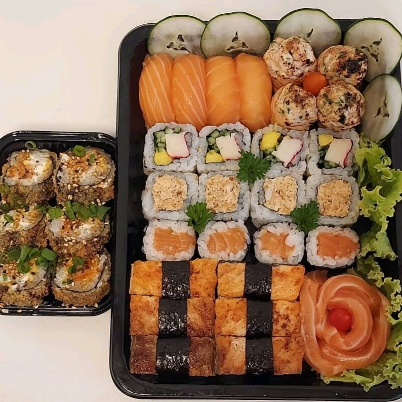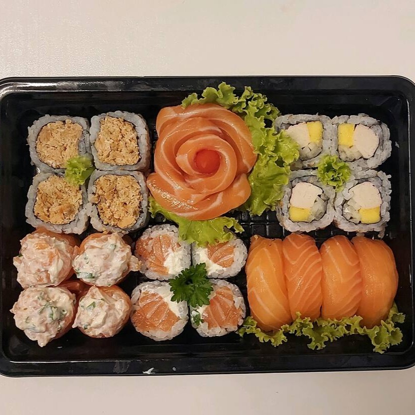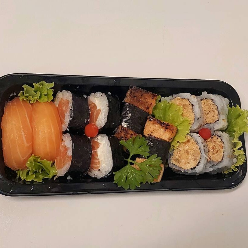 4 Niguiri de Salmão, 4 Maki Filadélfia, 4 Uramaki Grelhado, 4 Djoe Filadéfia,