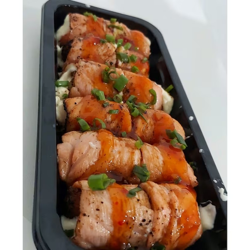 Experimente o elegante Maki de Salmão Grelhado, onde o salmão levemente grelhado se encontra com arroz temperado e alga nori, criando uma harmonia de sabores.