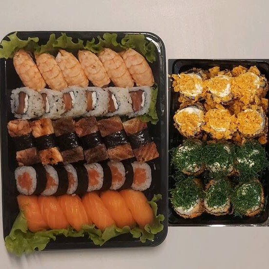 4 Niguiri de Salmão , 6 Niguiri Skin, 4 Maki Salmão, 4 Uramaki Grelhado, 4 Uramaki Califórnia, 4 Djoe Maçaricado, 4 Sashimi de Salmão, e 6 Hot Filadélfia.