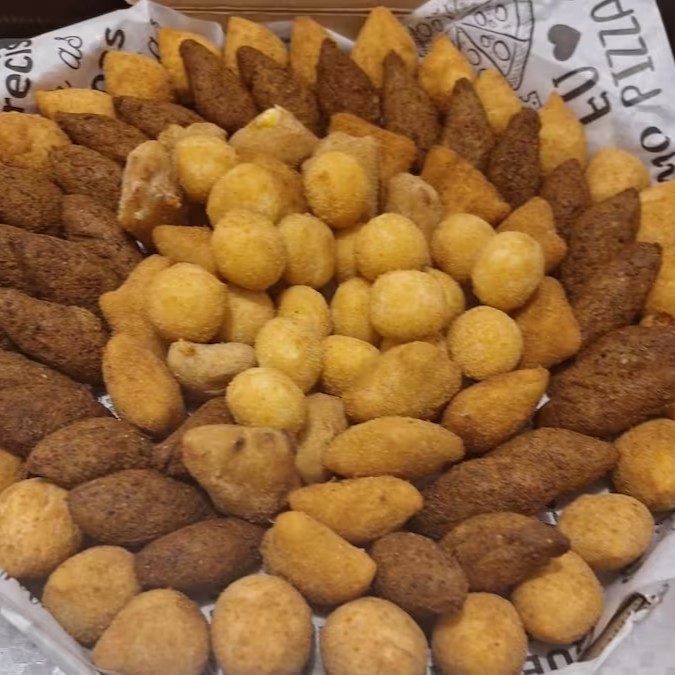 Experimente nosso saboroso combo de salgados, onde você escolhe entre coxinha, risole de milho, croquete de pizza, kibe e bolinha de queijo.