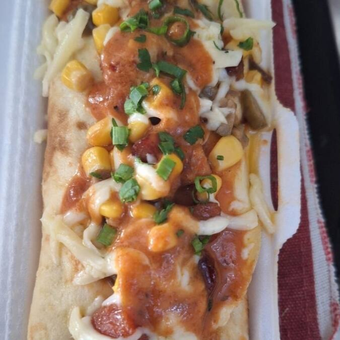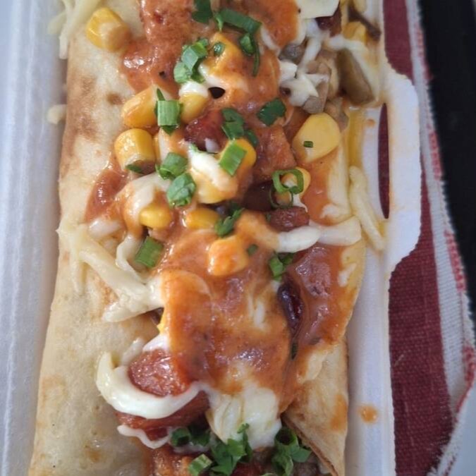 Experimente nossa panqueca recheada com uma combinação irresistível de frango desfiado, Catupiry, milho, azeitona e mussarela.