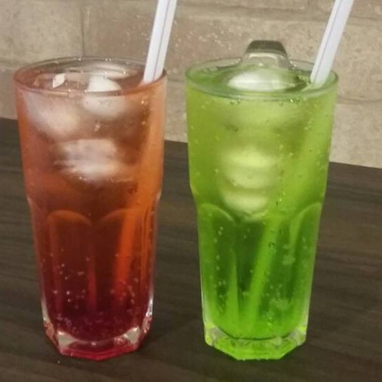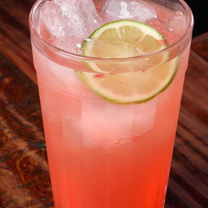 Suco de limão, gelo e calda de morango