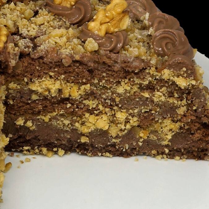Pão de ló de chocolate, creme de chocolate com nozes e cobertura de ganache com nozes