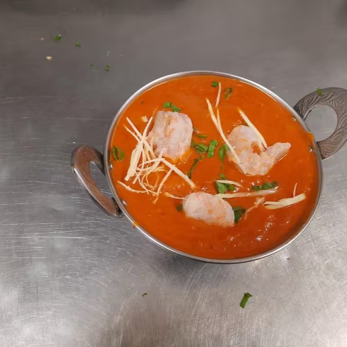Camarao preparado com molho de castanha de caju e especarias indianas