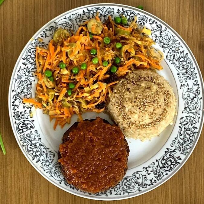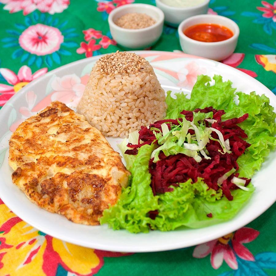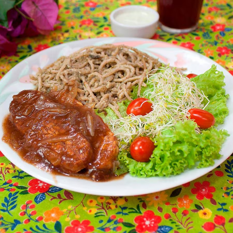 - Bifes (Soja ao Sugo, Grão de Bico, Tempeh Acebolado, Tofú Acebolado, Lentilha, Feijão Azuki)