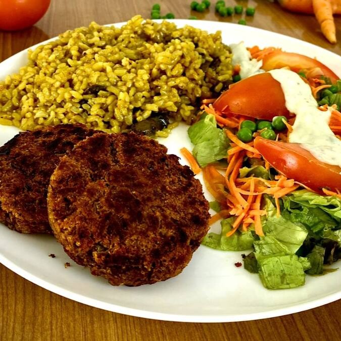 Arroz Com Cogumelo Ao Vinho, Bife De Lentilha E Salada | Vegano