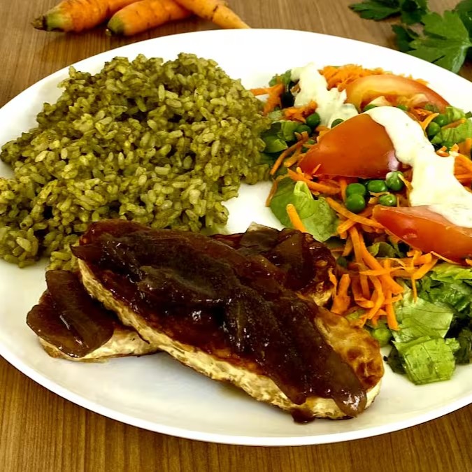 Tempeh Acebolado Com Macarrão Integral Ao Pesto E Salada | Vegano