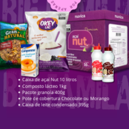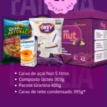 Kit Família Nut Preparado para você saborear com a família toda, o "Kit Família Nut" é completo para Todos vocês. Composto por: Caixa de 5 litros de Açaí Premium Nut 300g de composto lácteo 400g de granola 1 caixa de leite condensado 395g Você não vai encontrar esse kit em outro lugar. Aproveite!!! Serve 4 pessoas