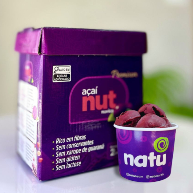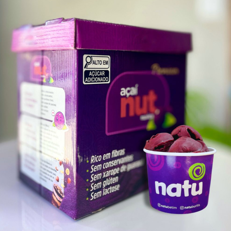 Açaí Nut 100% natural em caixa com 05 litros. Rico em fibras, antioxidantes e nutrientes como ferro, fósforo, potássio, vitaminas C, B1 e B2. Sem xarope de Guaraná Sem conservantes Sem glúten, lactose ou gordura trans Vegano e adoçado com açúcar cristal