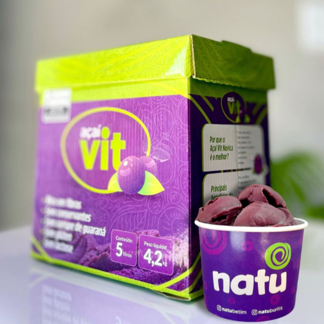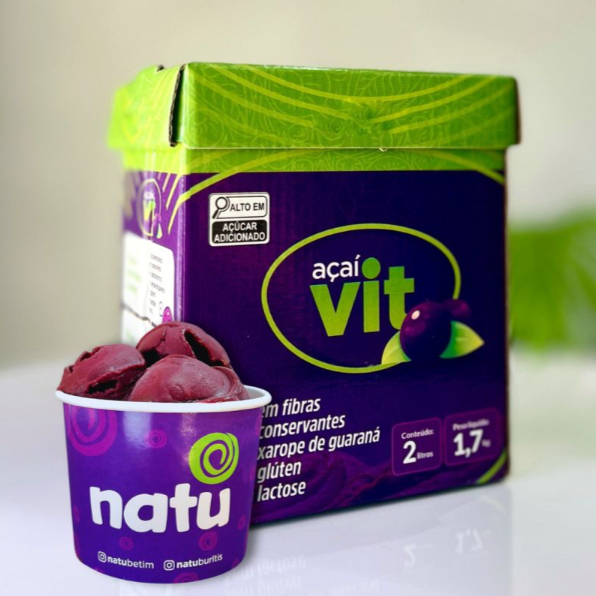 Açaí Vit em caixa com 02 litros (1,7 kg) – versão mais doce e super cremosa! Rico em fibras, antioxidantes e nutrientes como ferro, fósforo, potássio, vitaminas C, B1 e B2. Mais concentrado e refrescante Adoçado com açúcar cristal Sem xarope de Guaraná Sem conservantes, glúten, lactose ou gordura trans Vegano e ideal para dietas restritivas Textura firme, sabor equilibrado e qualidade premium direto do fabricante.