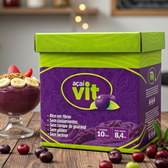 Açaí Vit em caixa com 10 litros (8,4 kg) – versão mais doce e super cremosa! Rico em fibras, antioxidantes e nutrientes como ferro, fósforo, potássio, vitaminas C, B1 e B2. Mais concentrado e refrescante Adoçado com açúcar cristal Sem xarope de Guaraná Sem conservantes, glúten, lactose ou gordura trans Vegano e ideal para dietas restritivas Textura firme, sabor equilibrado e qualidade premium direto do fabricante.